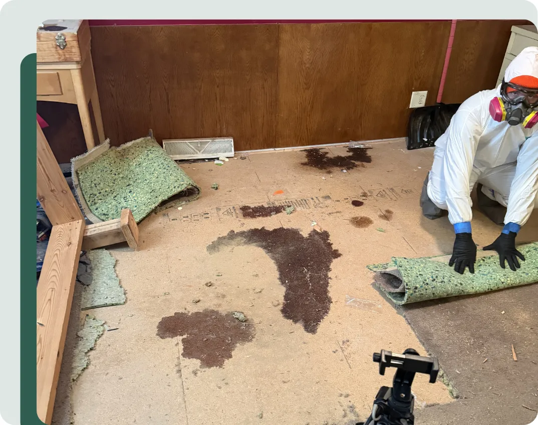 🧹 Removal of all carpet + padding (fully saturated with urine/feces)